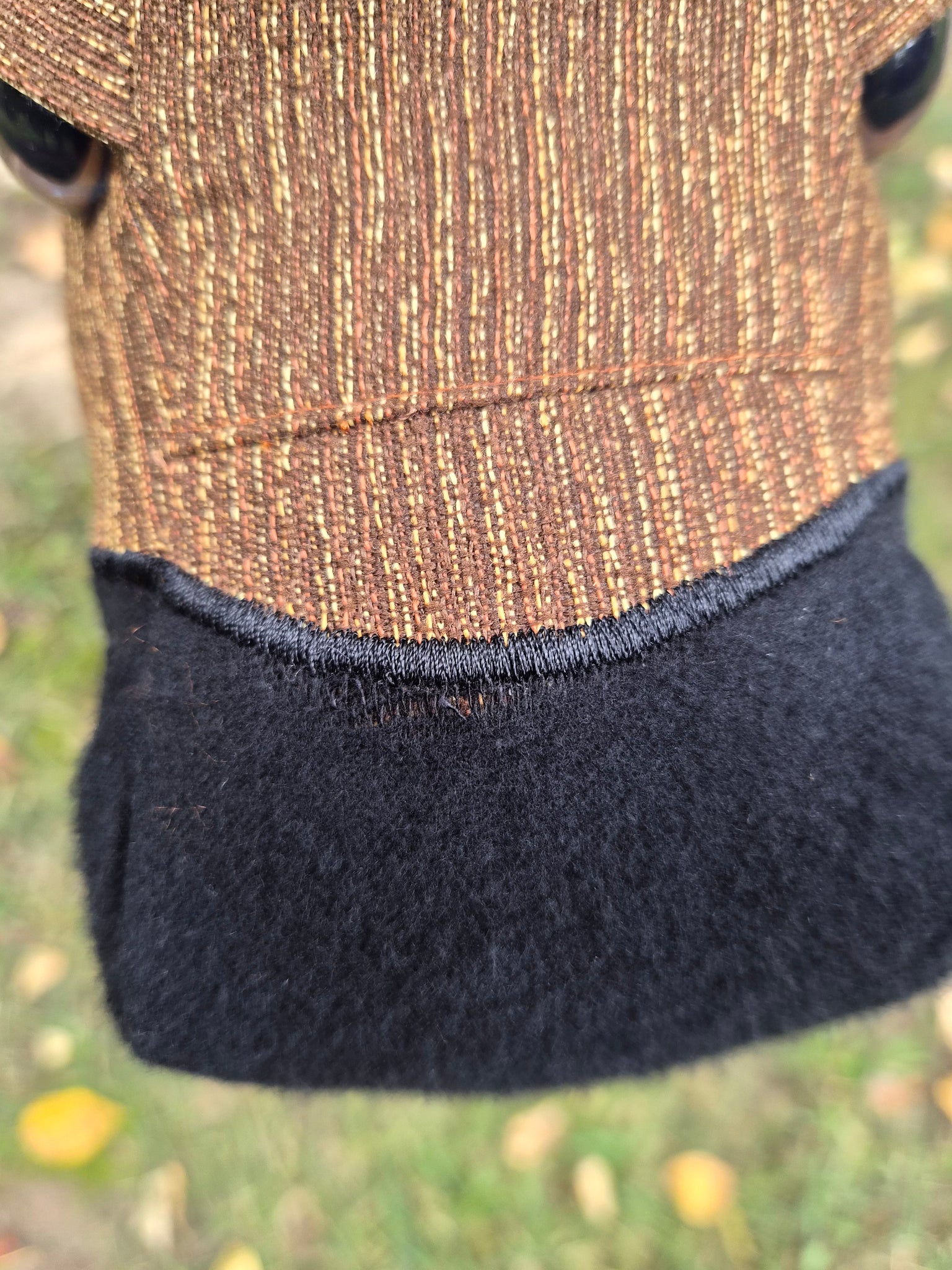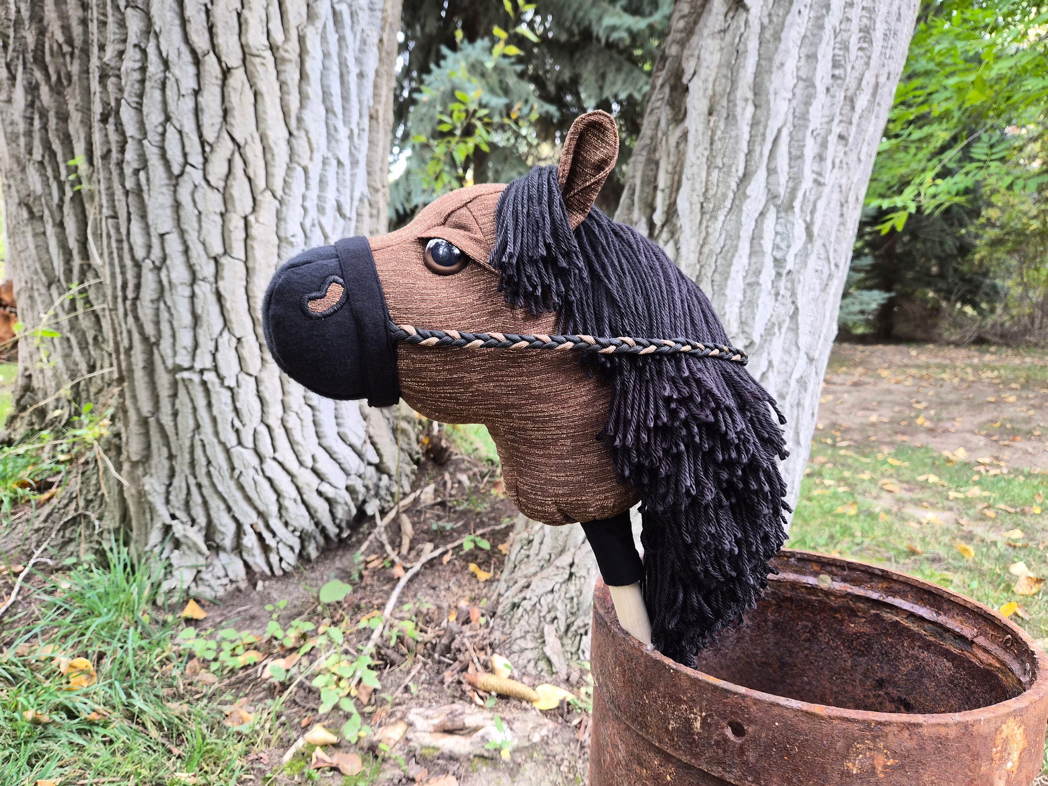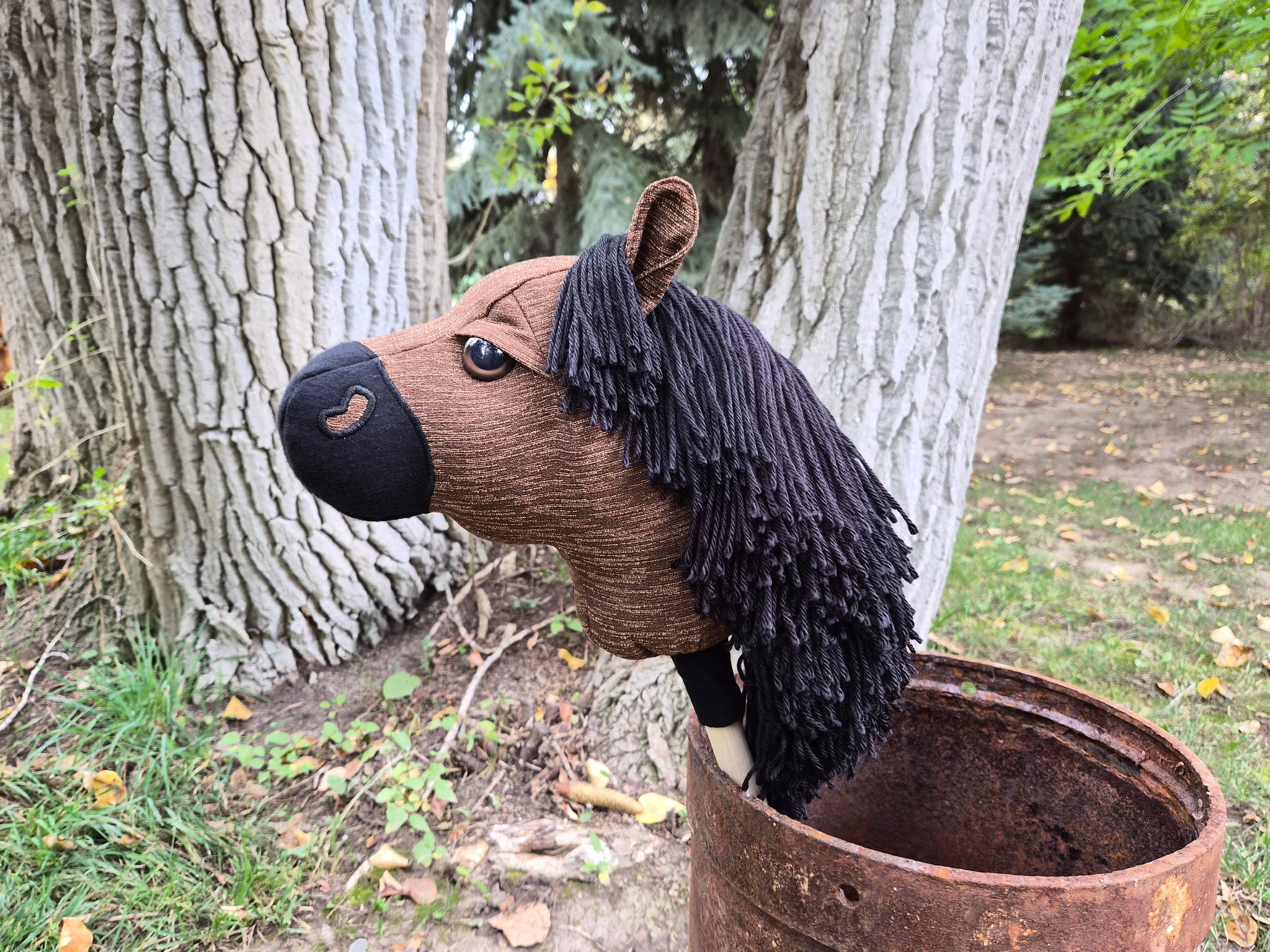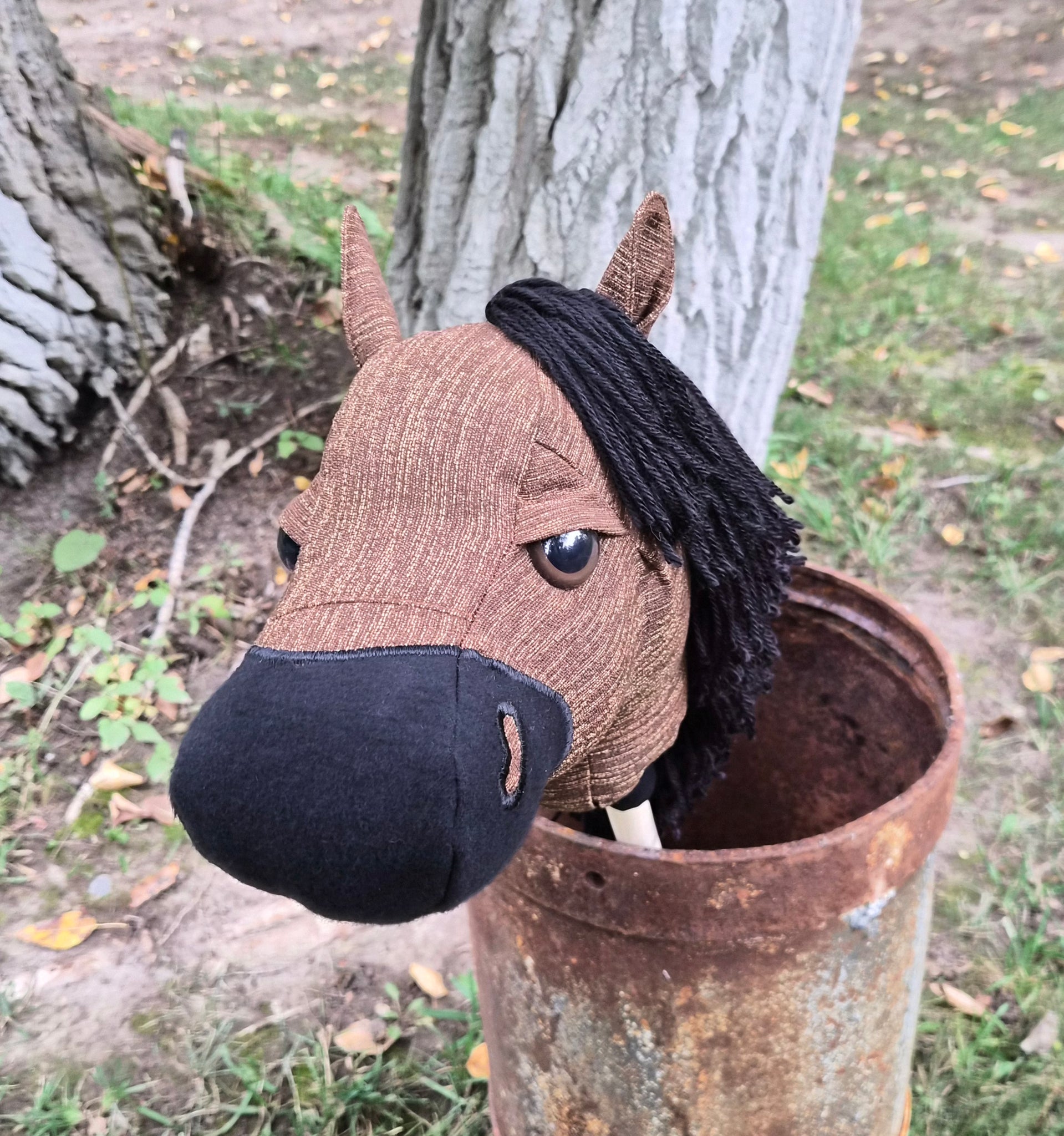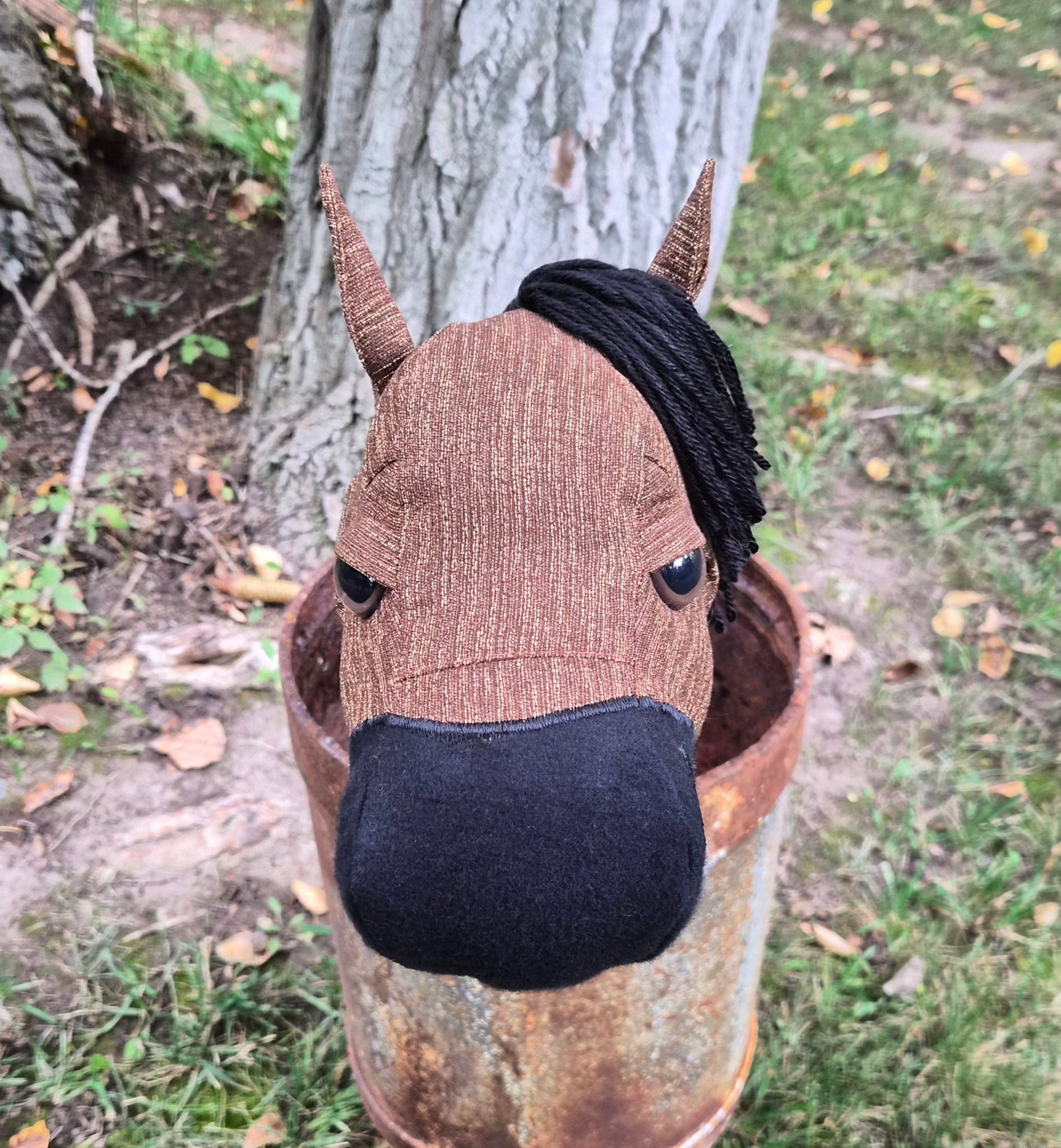 Duke is ready for his new home. Duke is sewn with brown upholstery fabric with a black flannel nose. Unfortunately Duke has a flaw on the top of his nose I didnt notice before putting him on a stick. The black flannel fabric has pulled and stretched. There is not a "hole" but depending on wear may develop one. There is still brown upholstery fabric underneath the black which should prevent any function issues but may not look perfect long term. Please see the close up picture of his nose.