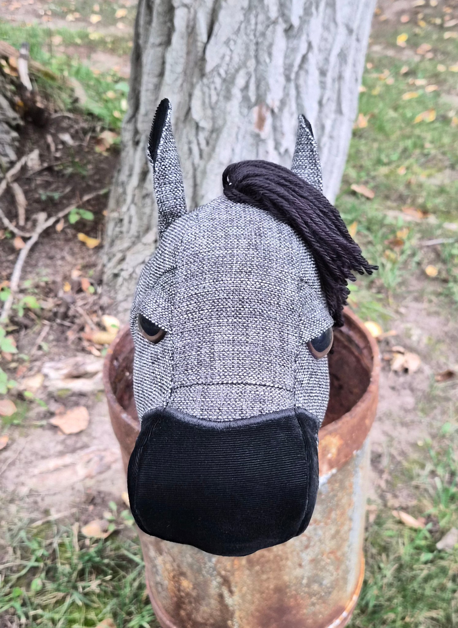 Leo is looking for his new home. Leo is sewn with grey and black speckled upholstery fabric with a black velvet nose. Unfortunately while sewing Leo I ran out of black fabric so his neck band and halter is a slightly different texture of velvet if this doesn't bother you then you can get a great deal on a high quality horse.