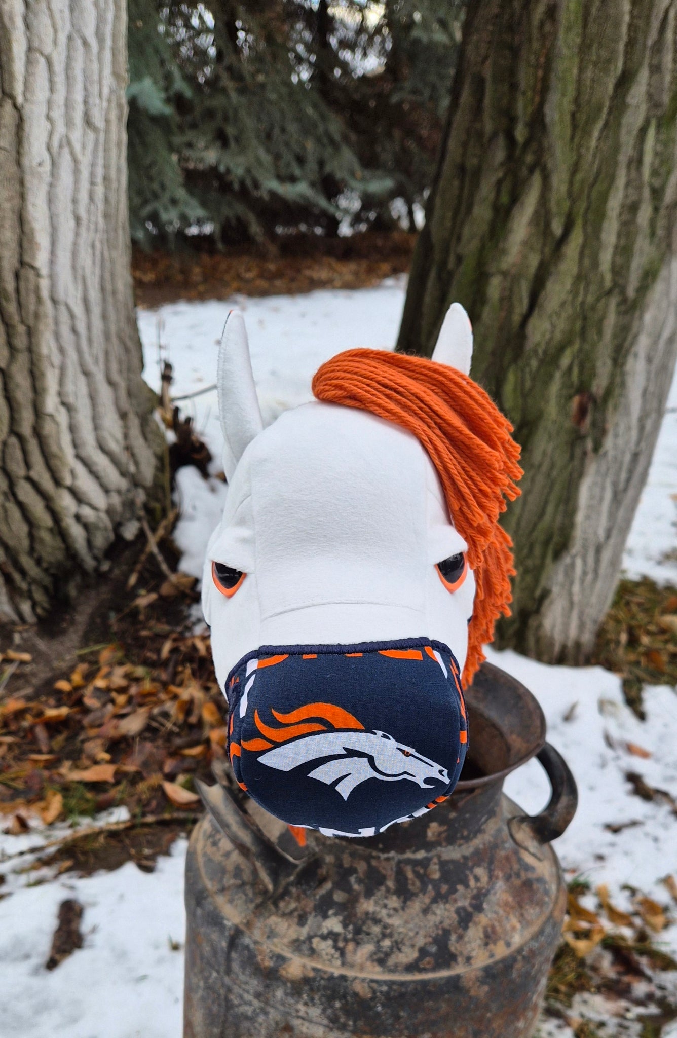 Your favorite footballer can now have a custom team horse. Introducing our Denver Broncos horse. Bronco is sewn with a soft fuzzy white fabric with navy blue stripes sewn onto the side of the head and Denver Bronco fabric for the nose this stick horse is sure to bring a winning season to your favorite team.